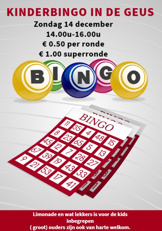 Zondag 14 December is er weer een leuke kinderbingo met mooie prijzen. Moeders,vaders en opa's en oma's zijn uiteraard ook van harte welkom. Er zijn 4 rondes,een kaartje kost € 0.50 en voor de laatste superronde € 1.00 Limonade en chips is gratis.
