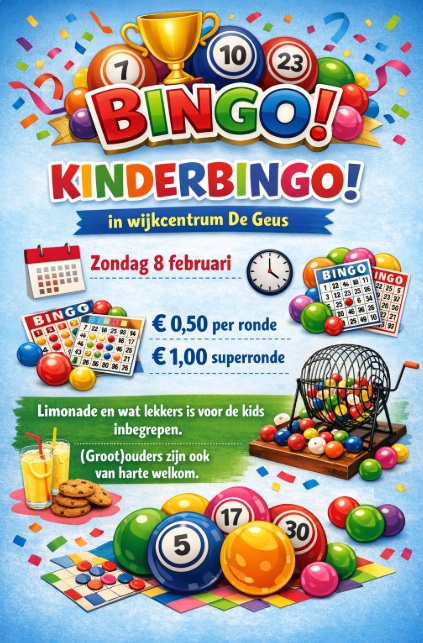 Zondag 8 februari is er weer een leuke kinderbingo met mooie prijzen. Moeders,vaders en opa's en oma's zijn uiteraard ook van harte welkom. Er zijn 4 rondes,een kaartje kost € 0.50 en voor de laatste superronde € 1.00 Limonade en chips is gratis.